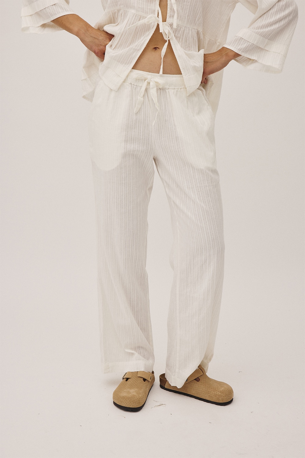 Natbukser fra Magasin du Nord Collection i den blødeste kvalitet af 100% økologisk bomuld med GOTS-certificering. Bukserne er enkle i modellen med det fineste mønster, sidelommer, en løs pasform samt elastik og bindebånd i taljen. WE LOVE TO CARE Global O