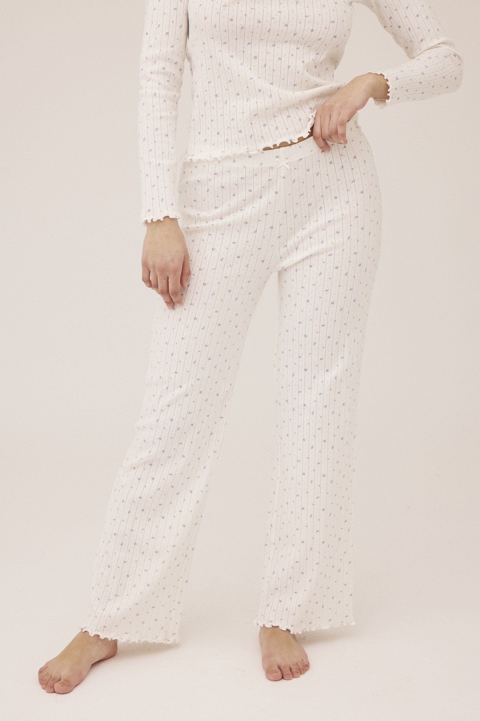 Bukser fra Magasin du Nord Collection i den blødeste kvalitet af 100% økologisk bomuld med GOTS-certificering. Bukserne er enkle i modellen med det fineste hulmønster, sløjfedetalje, bølgekant i bunden samt en smal elastik i taljen. Et par komfortable buk
