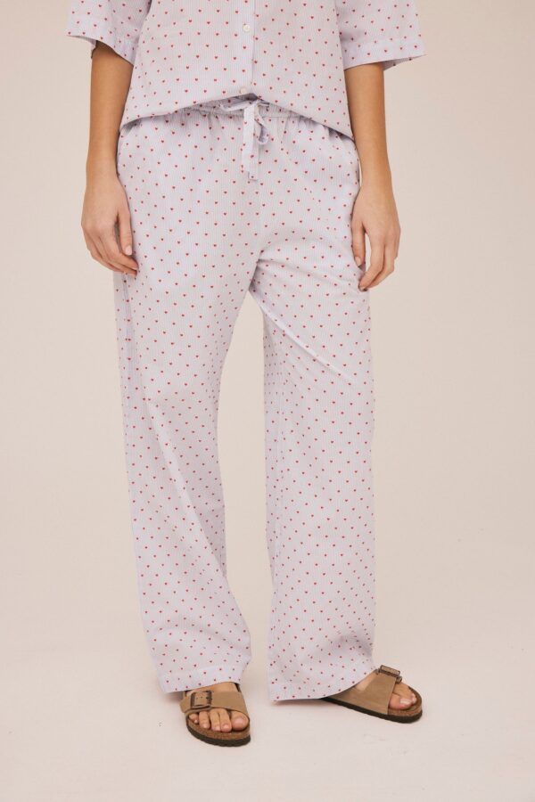 Bukser fra Magasin du Nord Collection i den blødeste kvalitet af 100% økologisk bomuld med GOTS-certificering. Bukserne er stribede med små, broderede hjerter i et fint allover mønster. Derudover har bukserne elastik og bindebånd i taljen, sidelommer samt