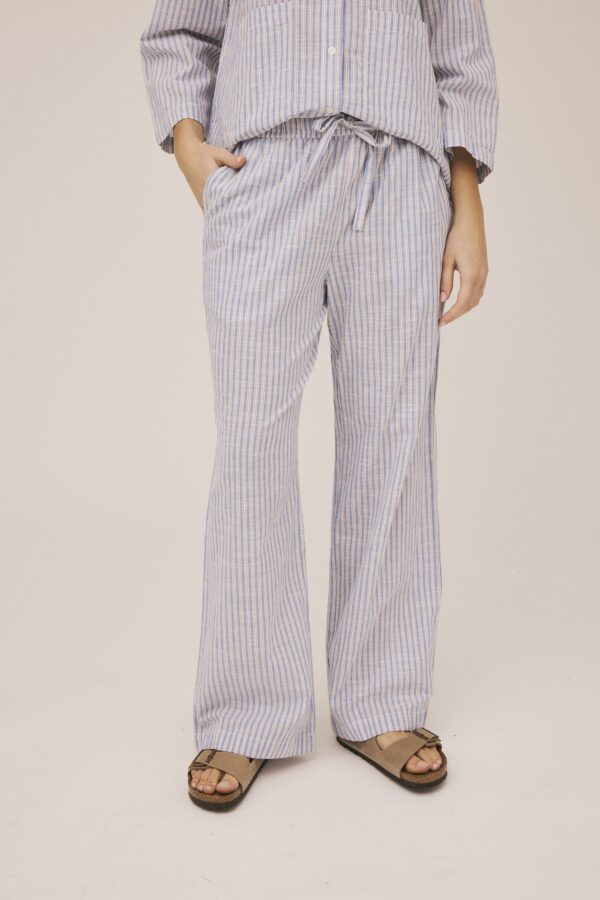 Bukser fra Magasin du Nord Collection i den blødeste kvalitet af 100% økologisk bomuld med GOTS-certificering. Bukserne er enkle i modellen med det fineste, stribede mønster, sidelommer, en bred elastik og bindebånd i taljen samt en løs pasform. Et par ko