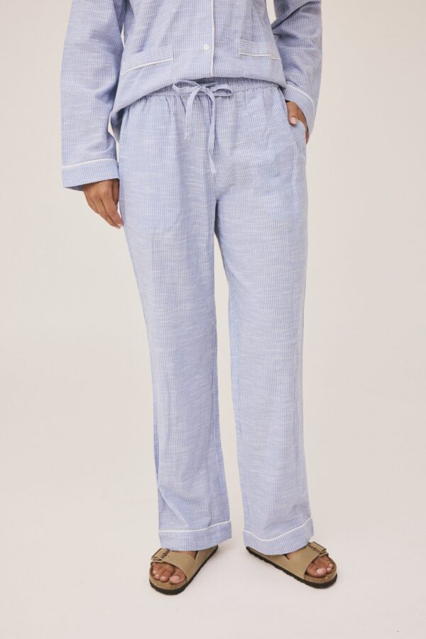 Bukser fra Magasin du Nord Collection i en blød og lækker 100% bomuldskvalitet med smalle striber. Bukserne har en løs pasform med elastik i taljen og bindebånd på fronten. Derudover har de praktiske lommer i siderne samt brede kanter forneden med pipingb