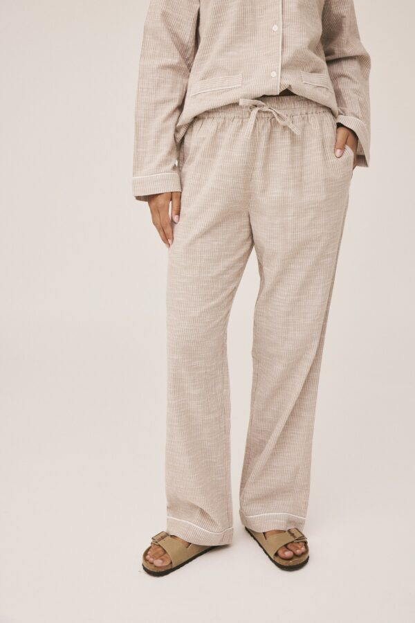 Bukser fra Magasin du Nord Collection i en blød og lækker 100% bomuldskvalitet med smalle striber. Bukserne har en løs pasform med elastik i taljen og bindebånd på fronten. Derudover har de praktiske lommer i siderne samt brede kanter forneden med pipingb