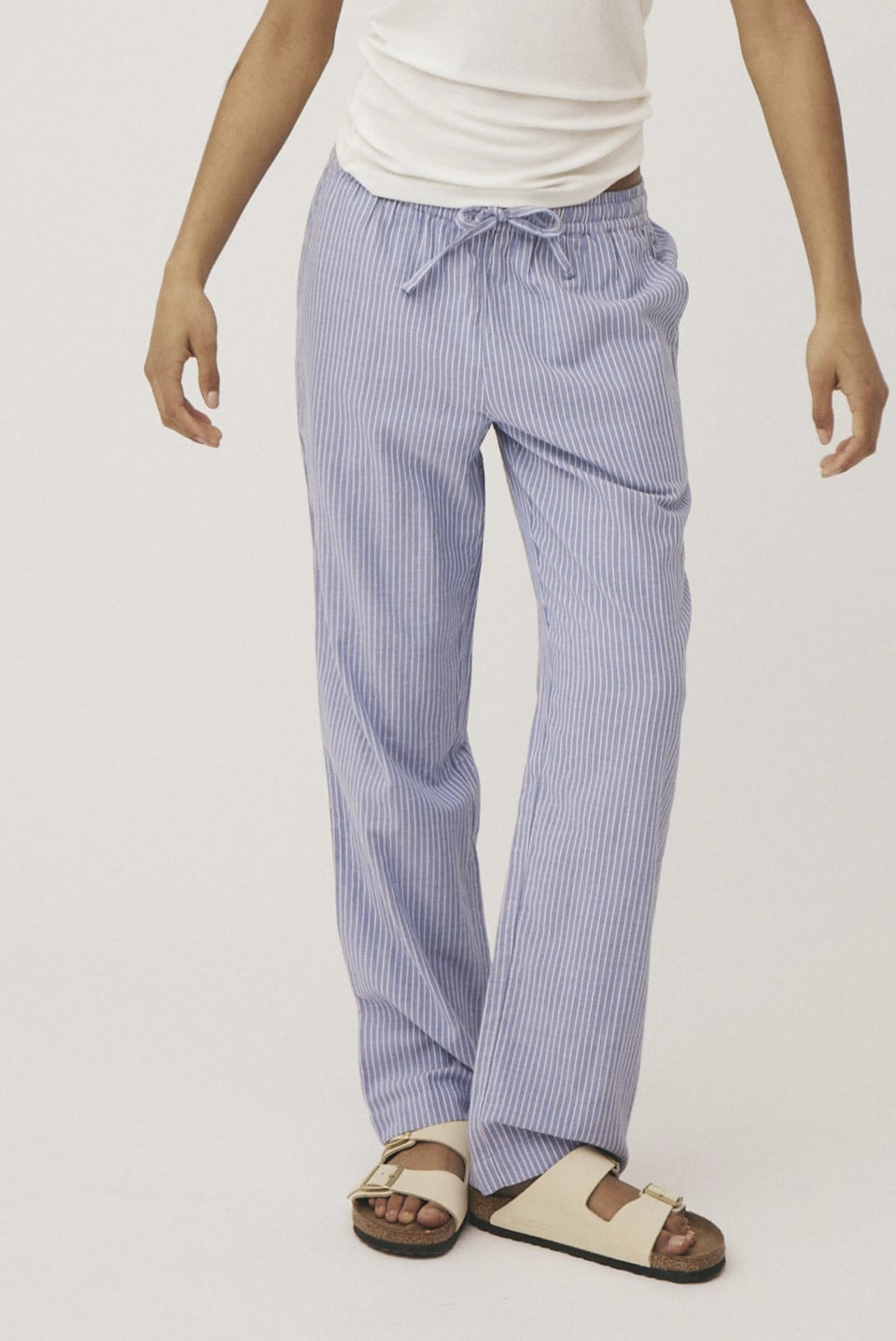 Vores model er 175 cm høj og bruger størrelse S. Stylen er størrelsessvarende. Stribede pyjamasbukser fra Magasin du Nord Collection i den blødeste kvalitet af 100% økologisk, GOTS-certificeret bomuld. Bukserne enkle i modellen med elastik og snøre i talj