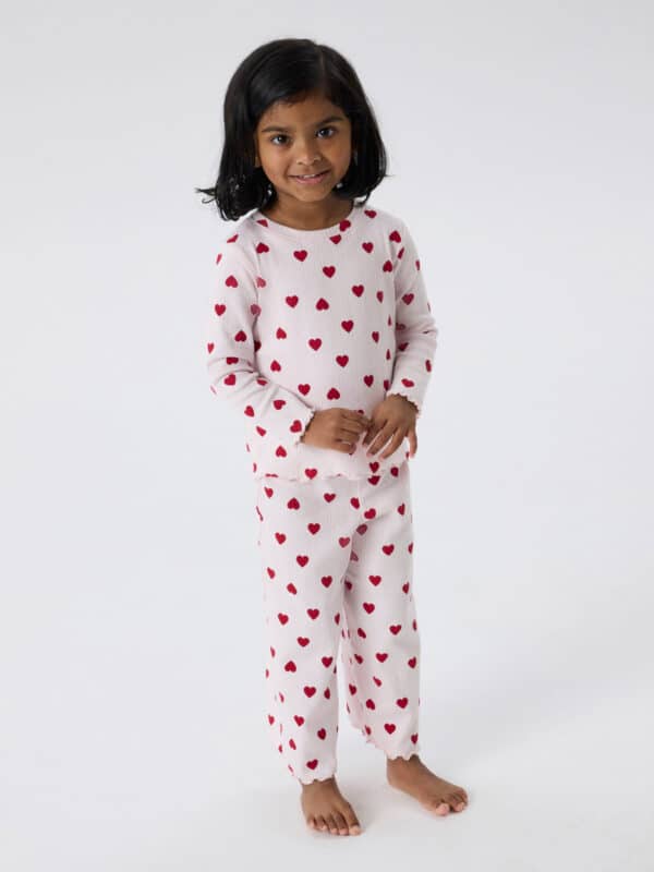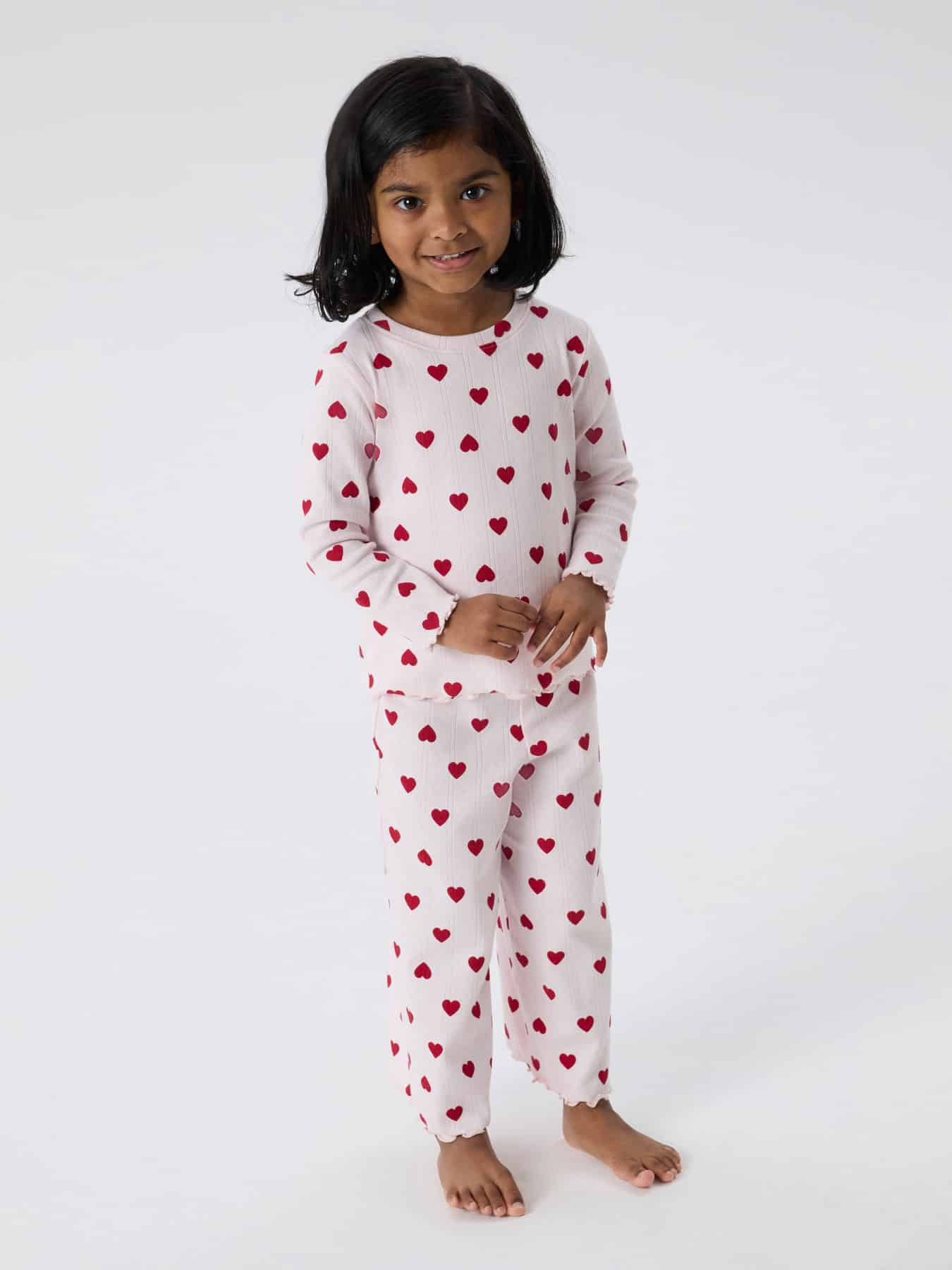 Mega søde natbukser fra Name it med hjerte print i de fineste farver. De er i super blød rib kvalitet, med elastikkant i livet og fine bølgekanter ved fødderne.