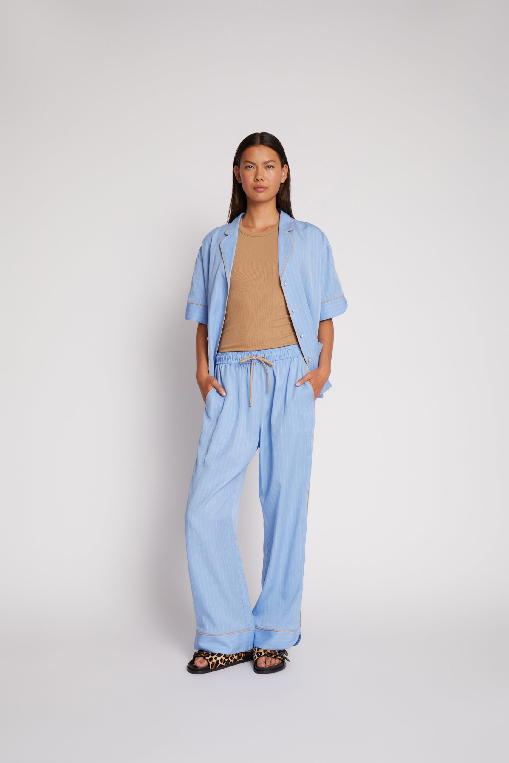 Denne vare udgår af sortiment og sælges til udsolgt. Ukava bukserne fra MUNTHE er et par elegante nålestribede bukser med kontrastdetaljer i beige. Bukserne har lommer og bindes med et fint bindebånd i taljen.
